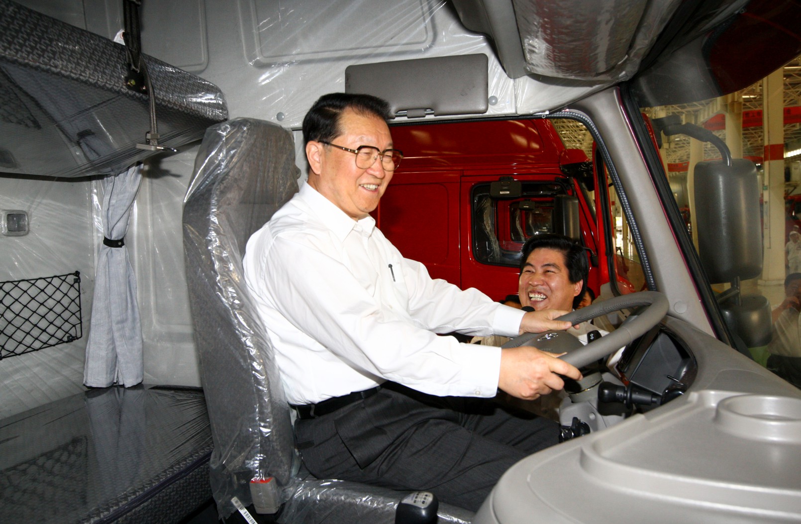 在大運重卡總裝生產車間,李長春還饒有興趣的登上兩米多高的重卡駕駛室,手握方向盤,親身體驗了解各項性能。看到車內有調頻收音機、空調,設施齊全,他連連稱好。